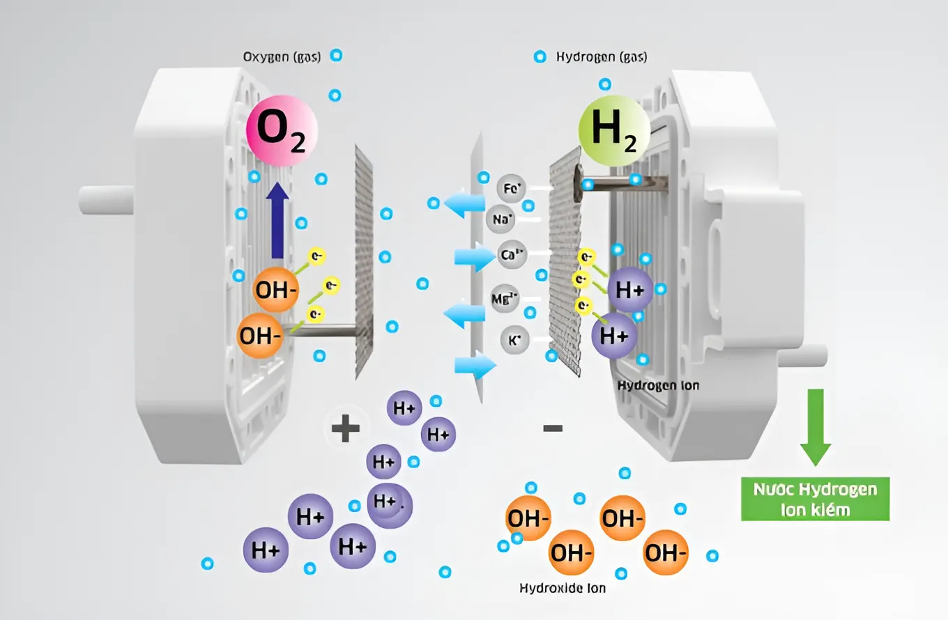 Nước RO sau khi tái khoáng nhẹ sẽ tiếp xúc với bề mặt điện cực âm, biến thành các phân tử hydrogen dưới dạng hạt vi bọt khí, được bao quanh bởi các phân tử hidrat. Điều này giúp các hạt hydrogen tồn tại trong nước lâu hơn, tạo ra nước có khả năng kháng oxy hóa mạnh mẽ với ORP đạt giá trị -600mV và nồng độ hydrogen từ 1.000-1.200 ppb.