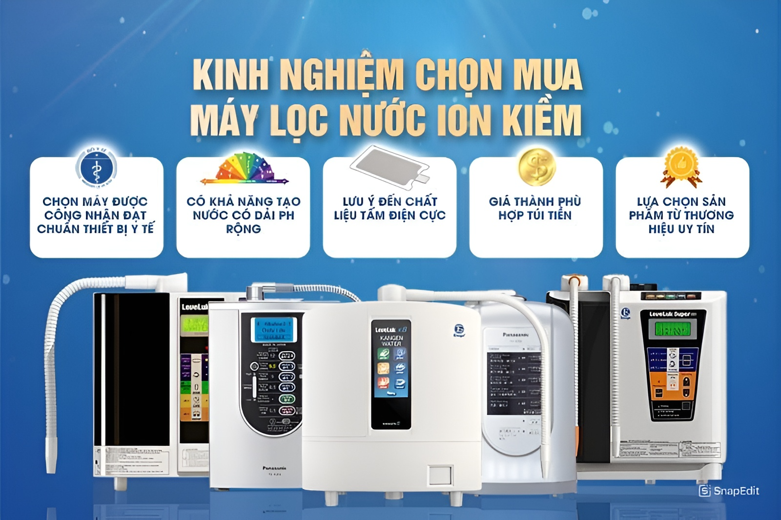 Máy lọc nước ion kiềm tạo ra dòng nước được đánh giá là “nước khỏe”, được đông đảo người tiêu dùng ưa chuộng. Thiết bị có khả năng tạo đến 12 loại nước khác nhau, tùy từng dòng máy, hỗ trợ chăm sóc sức khỏe và sắc đẹp cho người tiêu dùng.