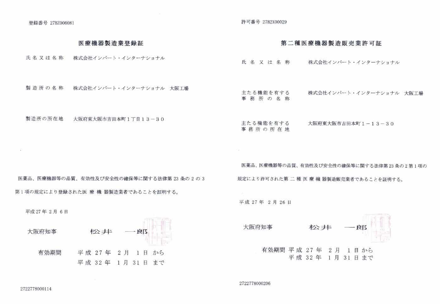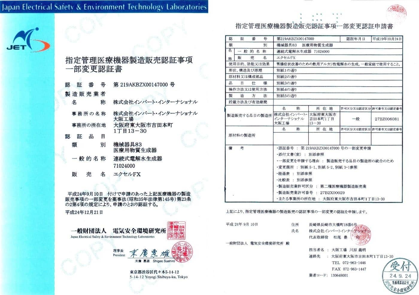 Impart Excel-IE400 (MX-33) được sản xuất 100% tại Nhật Bản và được chứng nhận là thiết bị y tế tại Nhật – 21500BZZ00213A08 và được Tổ chức Giám định độc lập quốc tế cấp giấy chứng nhận là sản phẩm đạt tiêu chuẩn chất lượng cao.