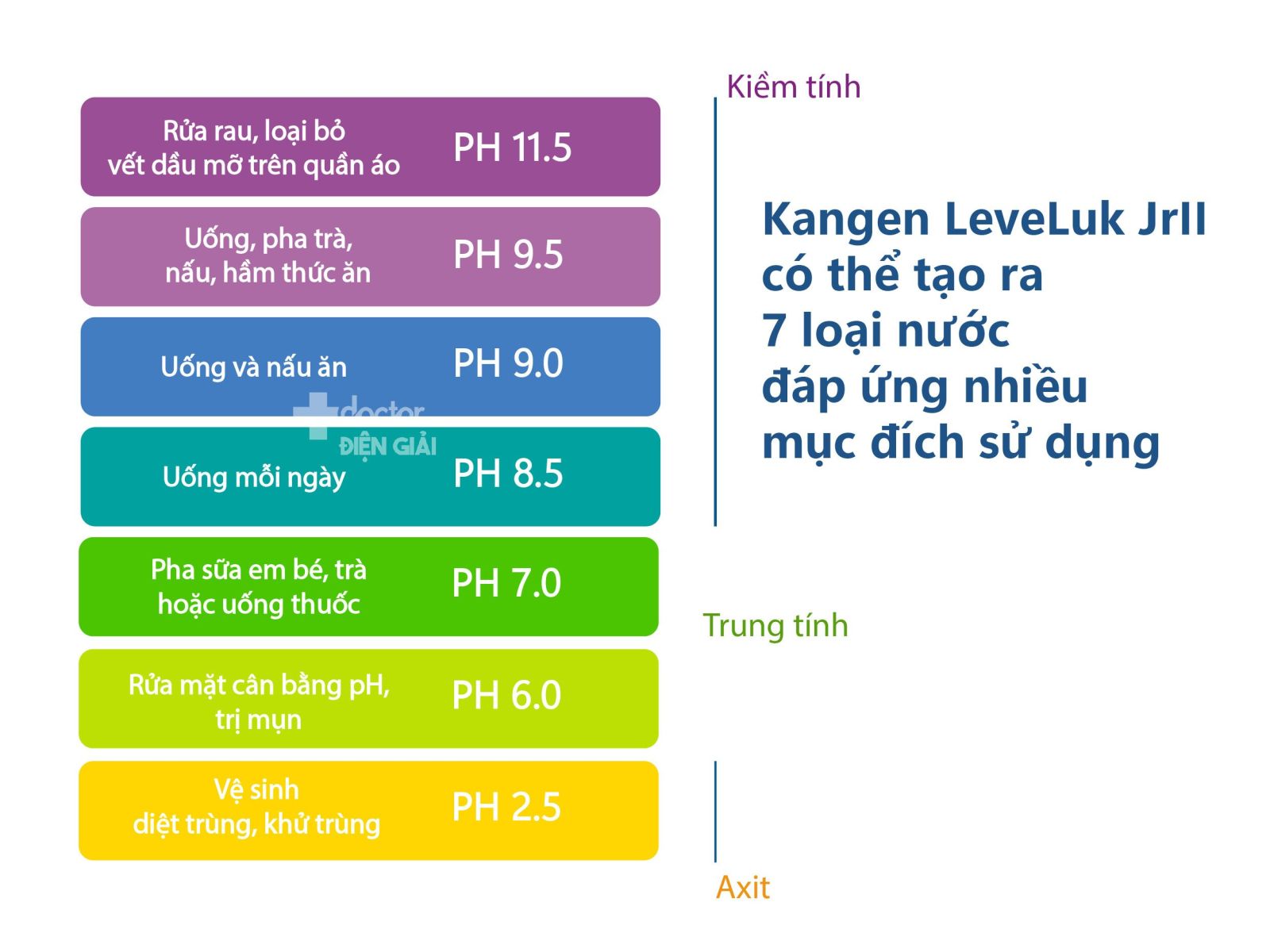 Máy lọc nước ion kiềm Kangen LeveLuk JrII còn tạo ra 7 loại nước chức năng khác nhau dao động trong khoảng pH 2.5 - 11.5 với 4 mức kiềm, 1 trung tính và 2 mức axit