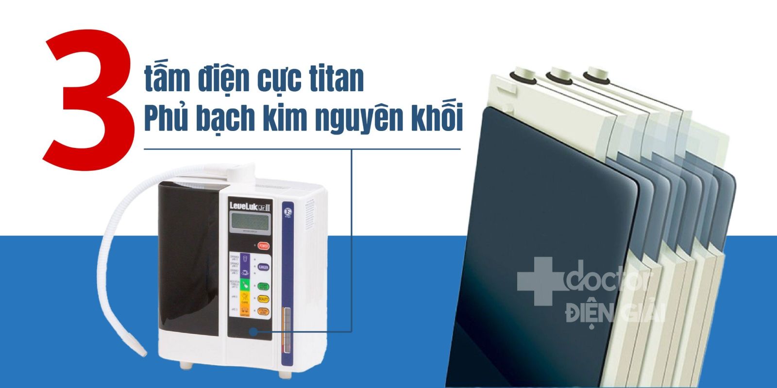 2. Sở hữu đến 3 tấm điện cực Titan phủ Bạch Kim nguyên khối cao cấp đảm bảo hiệu suất điện phân và tạo ra các loại nước chức năng với chất lượng đạt chuẩn.