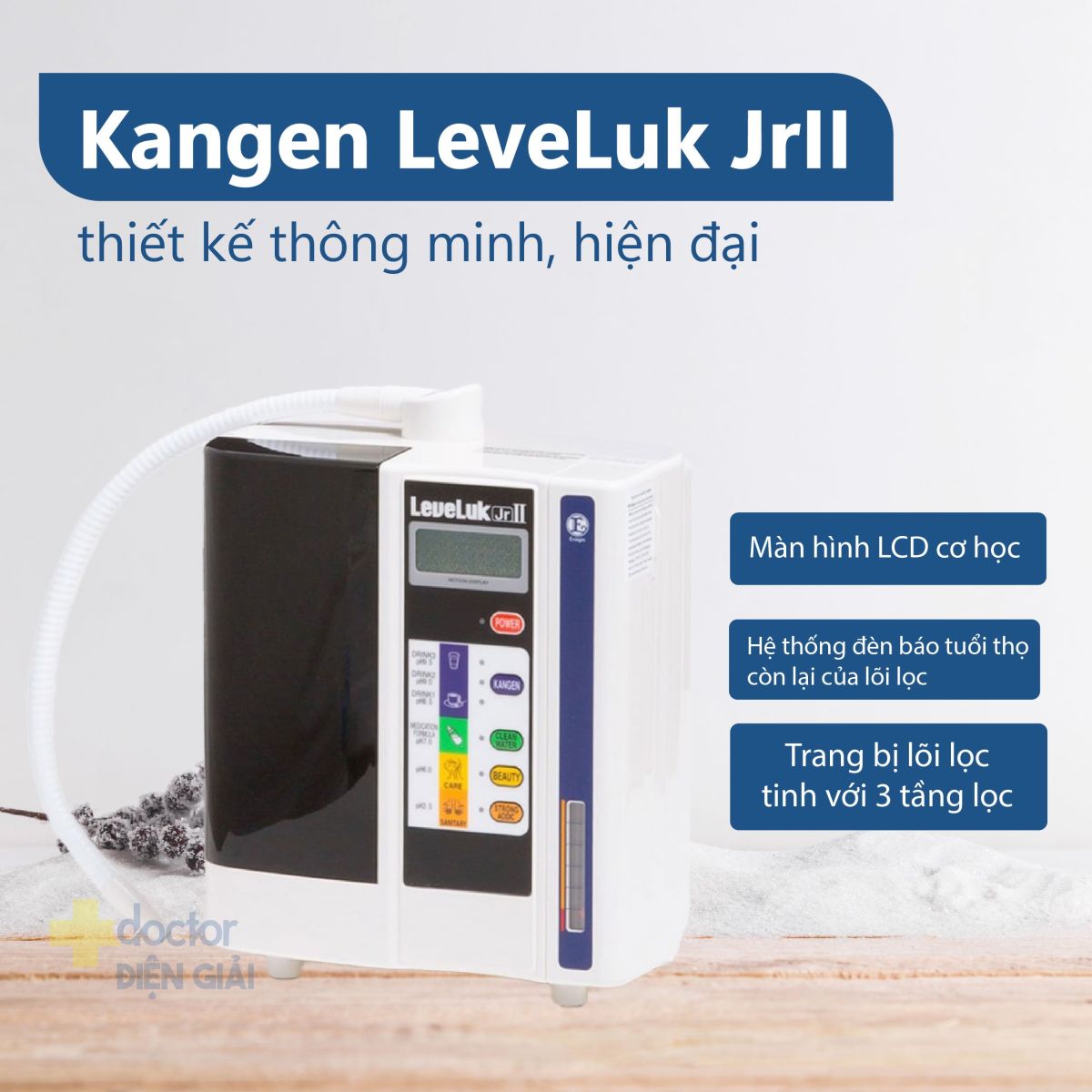 Kangen LeveLuk JrII có thiết kế mạnh mẽ được trang bị thêm màn hình LCD có độ sáng màn hình cao giúp hiển thị các thông số trực quan và rõ ràng và tính năng thông báo bằng giọng nói cùng hệ thống đèn báo nhờ đó giúp người dùng biết được tuổi thọ còn lại của lõi lọc và tự động thông báo khi máy cần thay lõi lọc