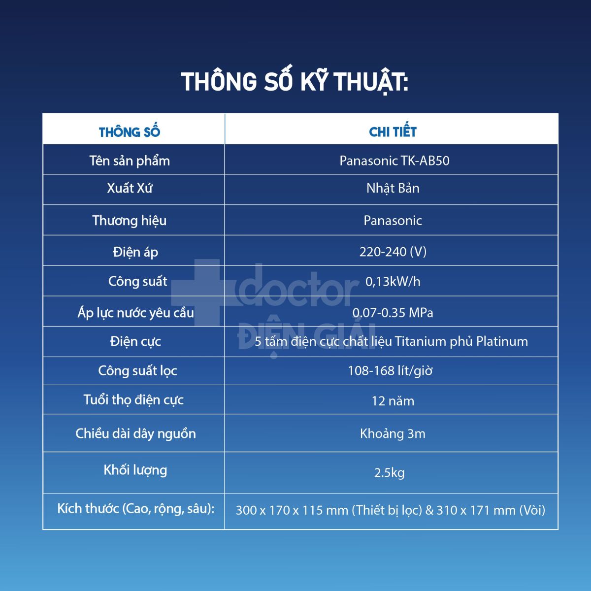 Máy lọc nước ion kiềm Panasonic TK-AB50 với thiết kế âm bồn sở hữu 5 tấm điện cực cùng hệ thống lọc 4 giai đoạn có thể loại bỏ hoàn toàn 17 tạp chất đem đến nguồn nước sạch an toàn cho sức khỏe, nâng cao chất lượng cuộc sống.