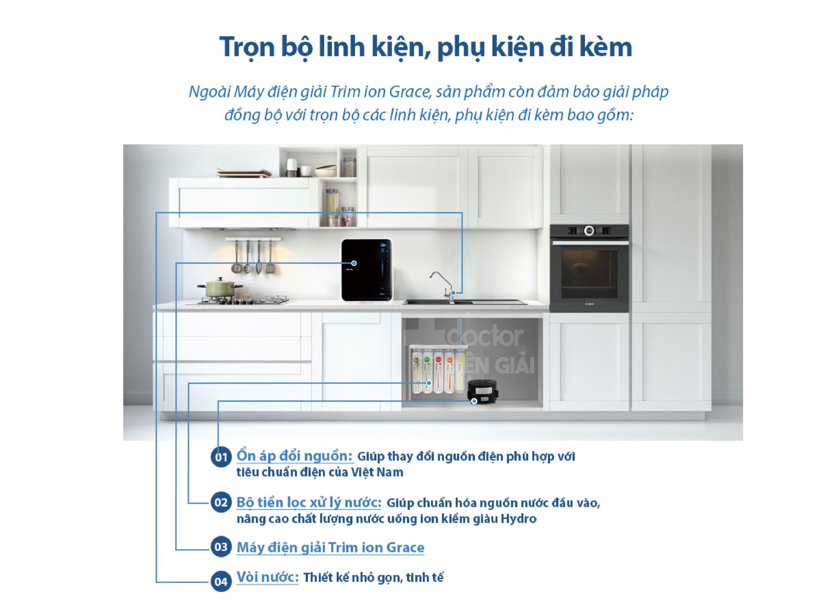 Trọn bộ linh kiện đi kèm gồm: Bộ lọc tiền xử lý nước, Vòi nước, Máy điện giải Trim ion Grace & Bộ ổn áp đổi nguồn