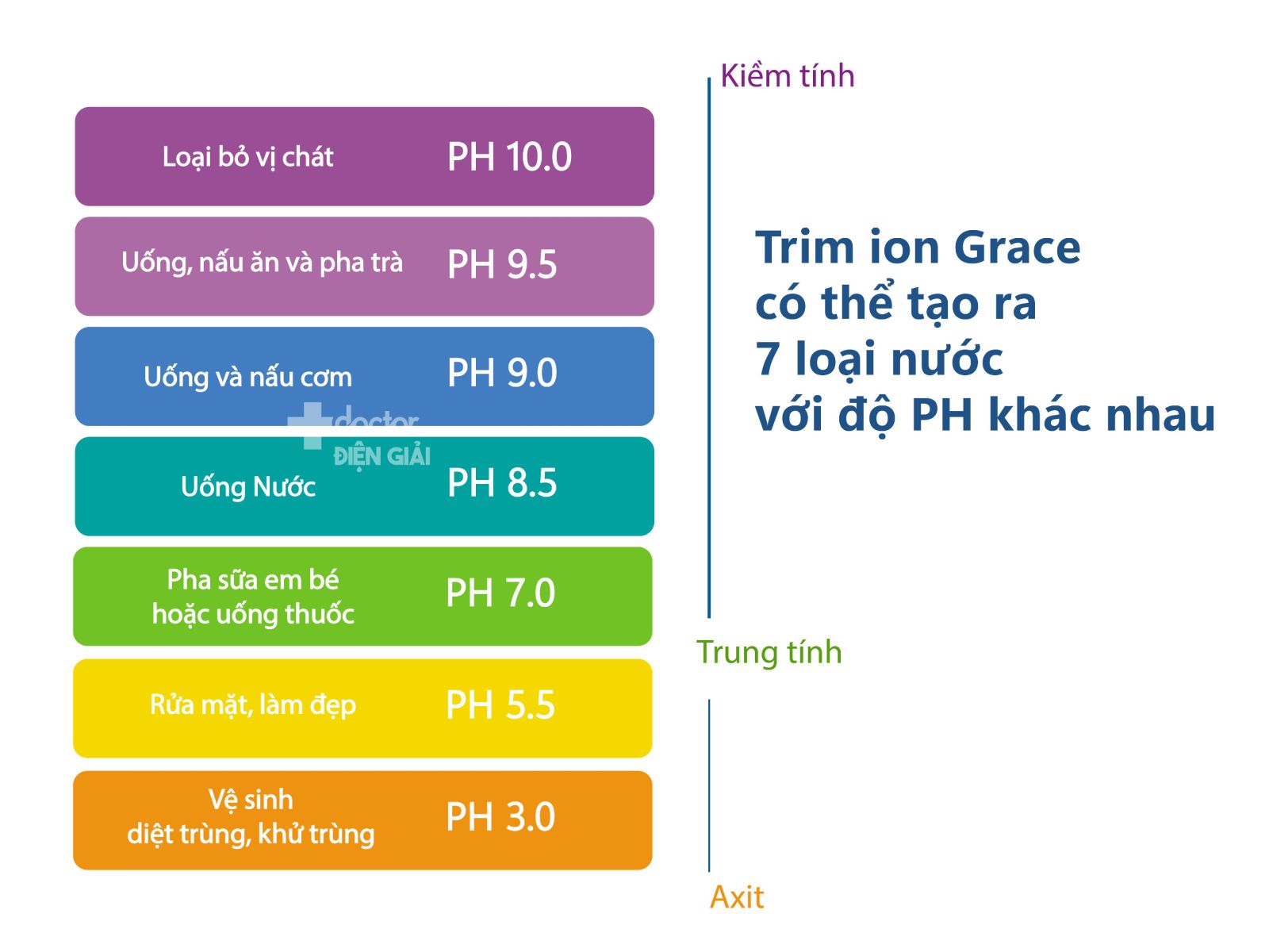 Trim ion Grace có thể tạo ra 7 chế độ nước bao gồm các loại nước kiềm hydro, nước trung tính, nước axit.