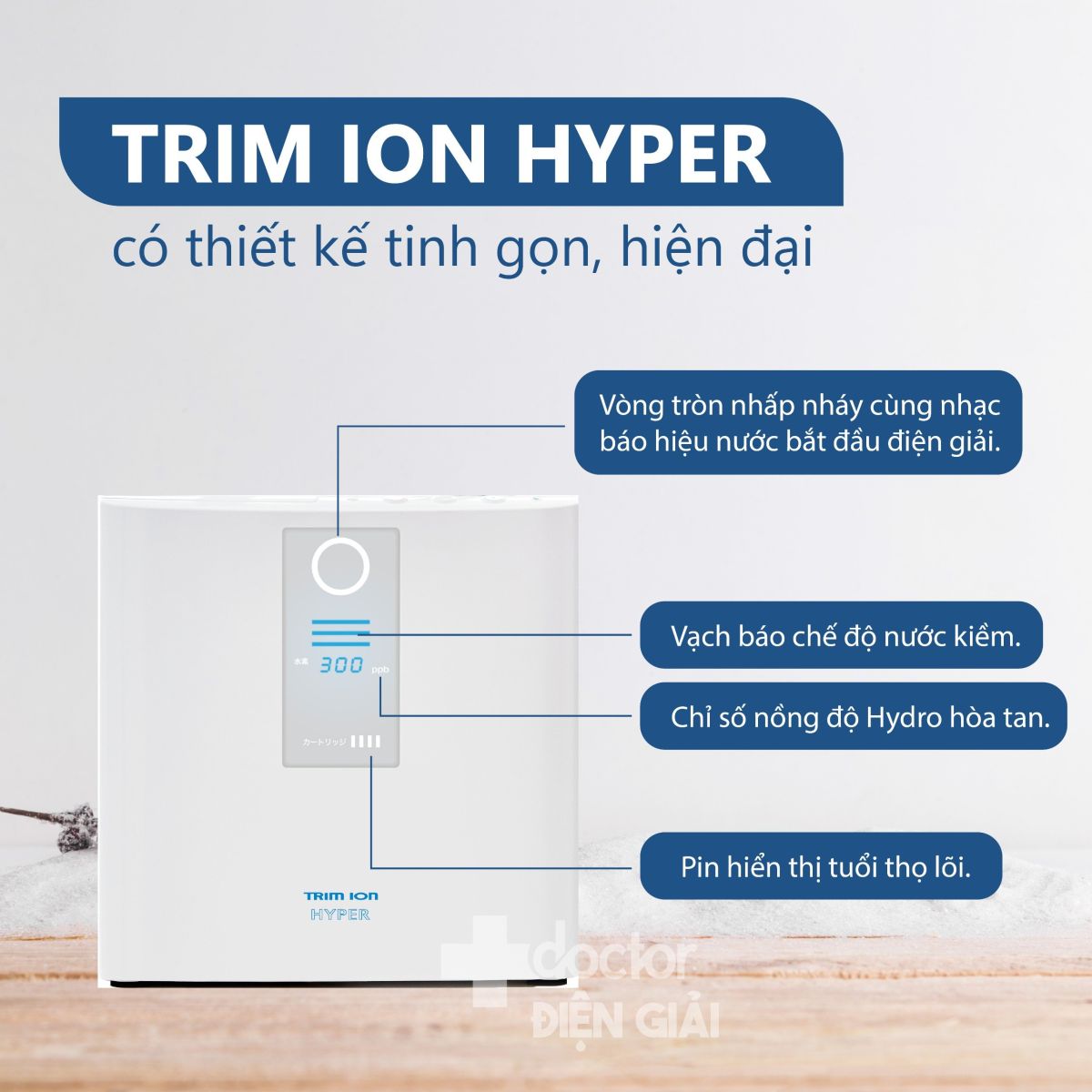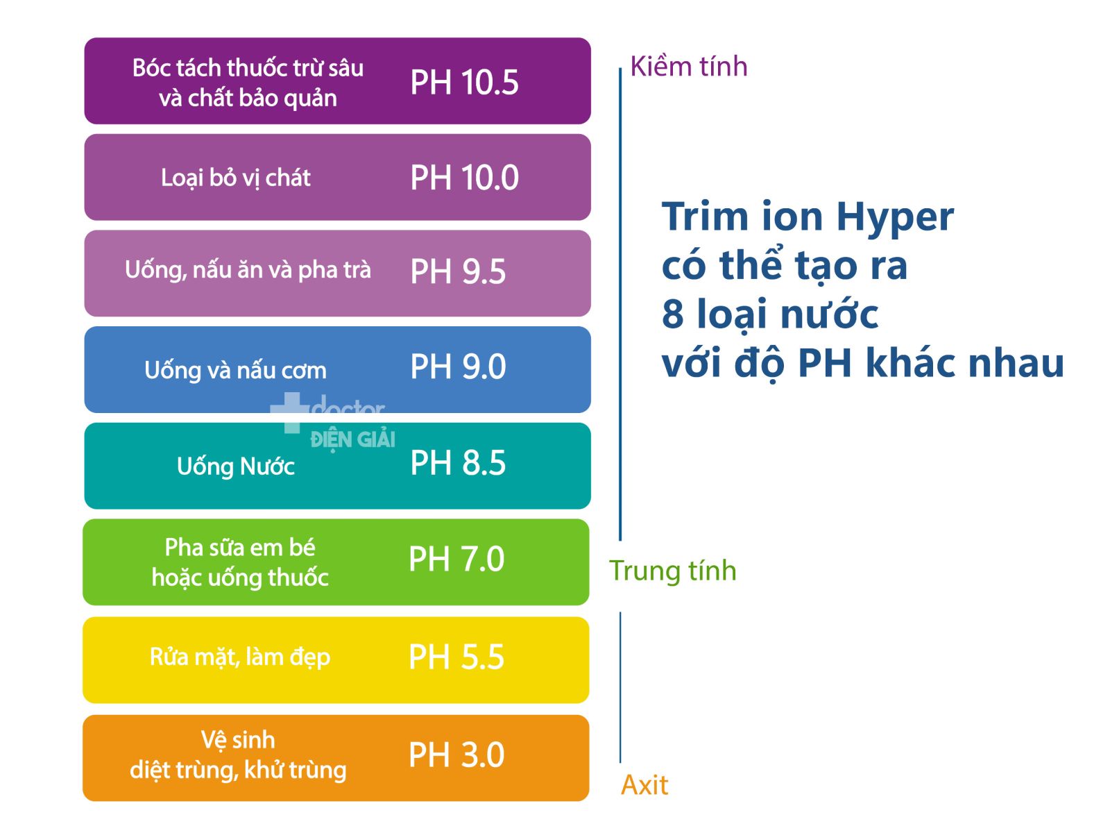 Trim ion Hyper có thể tạo ra 8 chế độ nước bao các loại nước kiềm hydro, nước trung tính, nước axit. Ngoài ra Trim Ion Hyper cũng có khả năng tạo ra nước uống với hàm lượng Hydro hòa tan lên tới 800ppb tăng mức độ chống oxy hóa cao hơn so với các dòng máy cùng phân khúc khác.