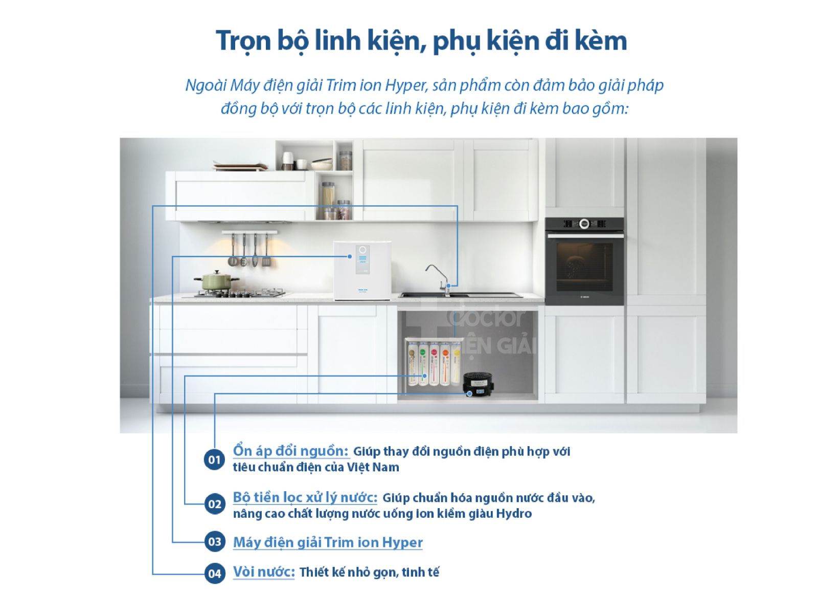 Trọn bộ linh kiện đi kèm gồm: Bộ ổn áp đổi nguồn, Bộ lọc tiền xử lý nước, Vòi nước & Máy điện giải Trim ion Hyper