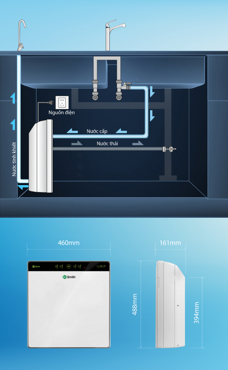 A. O. Smith AR75-U2 sở hữu thiết kế siêu mỏng với độ dày chỉ 161mm, giúp tiết kiệm tối đa không gian bếp cho gia đình bạn