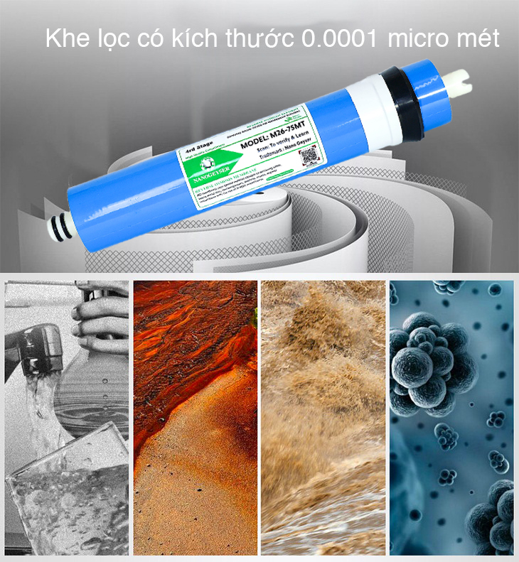 + Lõi số 5 màng RO: Màng lọc với các khe lọc có kích thước 0.0001 micro mét. Lọc bỏ các chất rắn, ion kim loại nặng. Lọc bỏ hoàn toàn những vi sinh vật, vi khuẩn… Mang đến nguồn nước ĐẠT CHUẨN QUỐC GIA NƯỚC UỐNG TRỰC TIẾP QCVN 6-1:2010/BYT