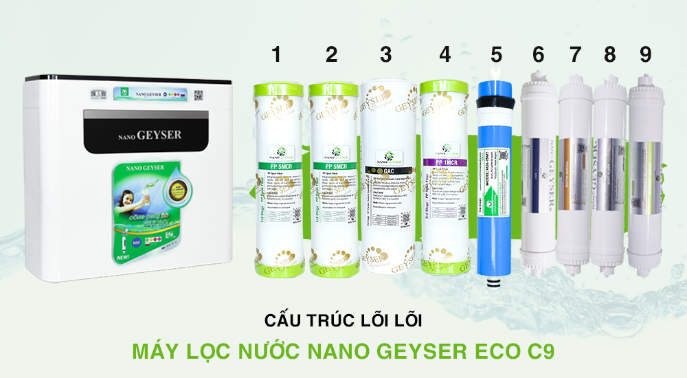 Được tích hợp với hệ thống 9 cấp lõi lọc vượt trội với công dụng chuyên biệt, máy lọc nước Nano Geyser Eco C9 giúp đảm bảo cho nguồn nước ĐẠT CHUẨN CẤP QUỐC GIA NƯỚC UỐNG TRỰC TIẾP