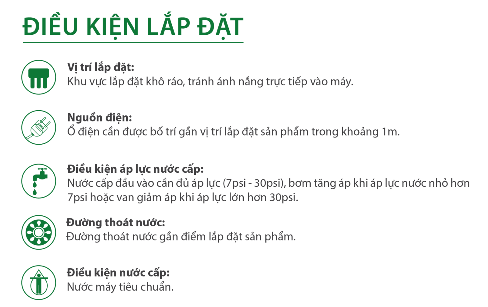 Áp suất nước cấp phù hợp: 0.05 MPa - 0.2 MPa (7psi - 30psi)