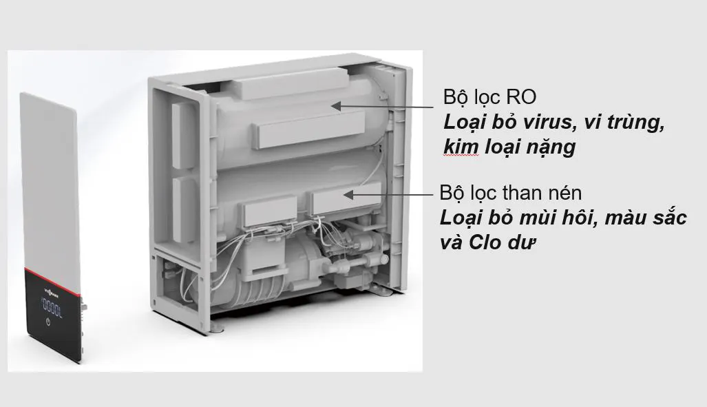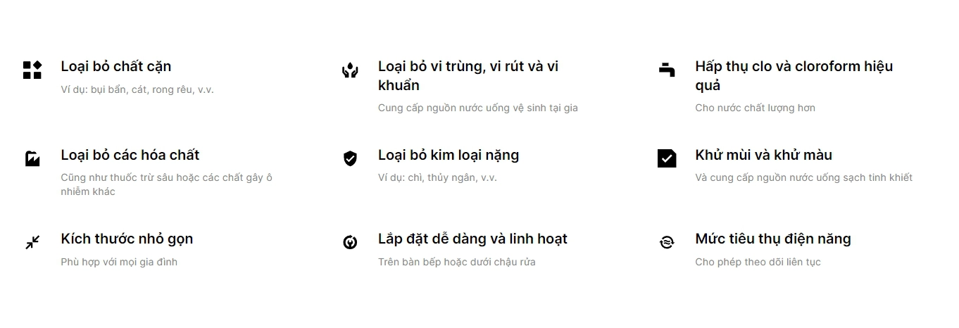 - Lõi lọc than hoạt tính carbon được hoạt hóa ở nhiệt độ cao, nâng cao khả năng hấp thụ và loại bỏ hiệu quả một lượng lớn chất gây ô nhiễm, mùi vị xấu và clo dư trong nước máy đô thị. Ngoài ra, màng PP lọc cơ học loại bỏ các chất rắn lơ lửng, cặn bẩn và huyền phù. Nước từ lõi lọc than hoạt tính được ký hiệu là lõi lọc 1 trên màn hình LED và tương ứng với ký hiệu giọt nước trên vòi nước. Sau khi được lọc từ lõi lọc 1, nước có thể sử dụng để sinh hoạt như rửa rau củ quả, thịt cá, rửa mặt,… mà không lo sợ về lượng clo tồn dư.