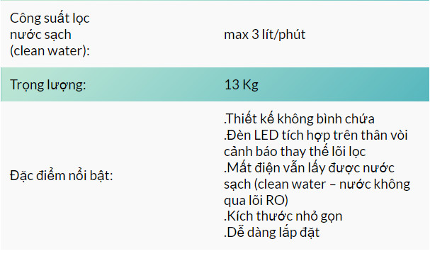 - Thời gian thay lõi lên đến 12 tháng tương đương 6000L.