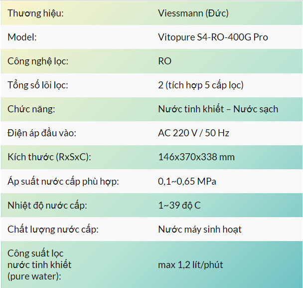 - Tuy chỉ được trang bị 2 lõi lọc, nhưng với công suất lọc lớn đến 3L/phút cho nước sạch và 1.2L/phút cho nước tinh khiết, Vitopure S4-RO-400G PRO chắc chắn sẽ đáp ứng được nhu cầu sử dụng nước liên tục cho cả gia đình, đem đến chất lượng nước hoàn hảo nhất, bảo vệ sức khỏe cho người sử dụng.