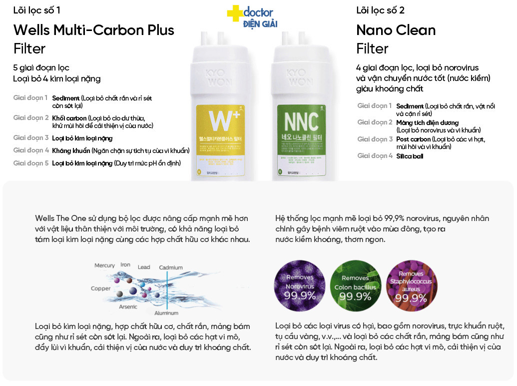 Nhờ được trang bị công nghệ mới hiệu suất mạnh, lõi lọc này có khả năng loại bỏ đến 99.9% norovirus (gây tiêu chảy, nôn mửa), Colon bacillus (trực khuẩn đại tràng), Staphylococcus aureus (tụ cầu vàng). Bộ lọc này cũng có thể loại bỏ cả vi hạt, tạp chất, rỉ sét, cải thiện mùi vị nước và giữ trọn những vi khoáng tự nhiên cần thiết cho cơ thể.