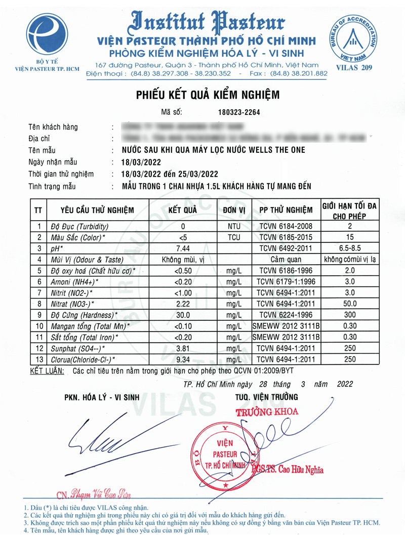Người dùng có thể trọn an tâm vì nguồn nước tạo ra từ máy lọc nước Wells The One Hàn Quốc đạt chuẩn nước uống trực tiếp bởi Viện Pasteur thành phố Hồ Chí Minh.