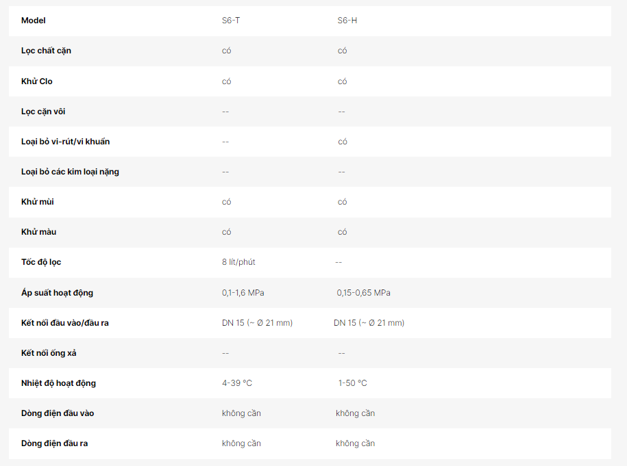 - Vitopure S6-H được trang bị lõi lọc được làm từ vật liệu cao cấp than hoạt tính gáo dừa (Coconut Shell Carbon), là sự kết hợp của hai vật liệu lọc trở lên trong một kết cấu duy nhất, mang lại nhiều lợi ích lọc hơn trong một thiết kế nhỏ gọn, đồng thời lõi lọc cho công suất lọc đến 8L/phút, đảm bảo nhu cầu sử dụng liên tục cho khách hàng. Lưu ý với lần đầu sử dụng, khách hàng nên xả nước khoảng 1 phút để loại bỏ bụi than trong lõi lọc.