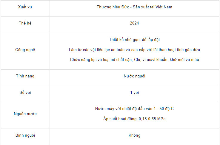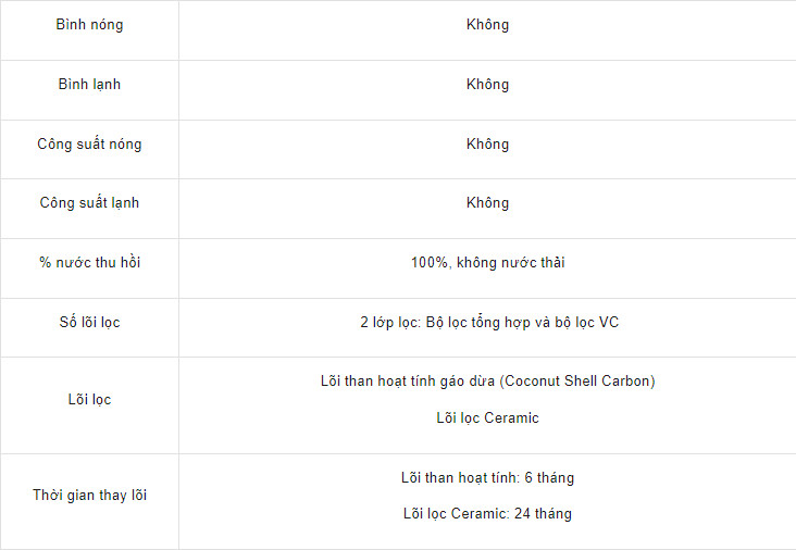 Bộ lọc tổng hợp: Lõi lọc than hoạt tính, có tác dụng chặn các chất bẩn, khử màu mùi khó chịu trong nước. Thời gian thay lõi: 6 tháng.