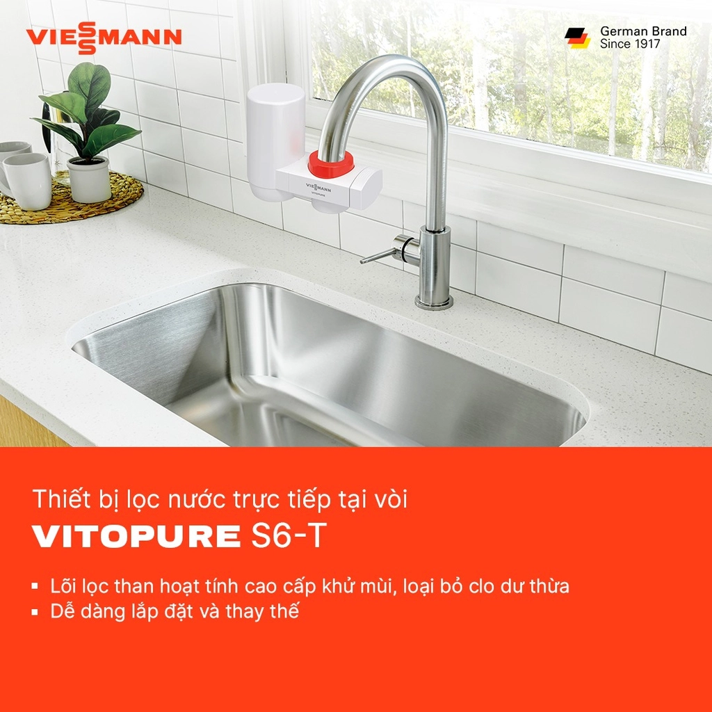 - Tương tự như thiết bị lọc sen tắm Vitopure S6-H, thiết bị lọc nước trực tiếp tại vòi Vitopure S6-T có thiết kế vô cùng nhỏ gọn và đơn giản, khách hàng có thể tự lắp đặt tại nhà hoặc mang đi du lịch mà không cần quá nhiều thao tác phức tạp. Với thiết bị lọc nước này, nguồn nước nhà bạn sẽ đảm bảo sạch sẽ, phù hợp với nhu cầu sinh hoạt và nấu ăn nhờ việc hấp thụ Clo, khử mùi và màu, loại bỏ các chất cặn... Tuy nhiên, nguồn nước sau lọc không dùng để uống trực tiếp.