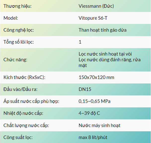 - Vitopure S6-T được trang bị 1 lõi lọc được làm từ vật liệu cao cấp than hoạt tính gáo dừa (Coconut Shell Carbon) với 90% diện tích bề mặt là các lỗ xốp siêu nhỏ, giúp cho diện tích tiếp xúc trực tiếp với nước nhiều hơn, hấp thụ nhiều chất có hại hơn, đồng thời lõi lọc cho công suất lọc đến 8L/phút, đảm bảo nhu cầu sử dụng liên tục cho khách hàng. Thời gian thay lõi lên đến 6 tháng.